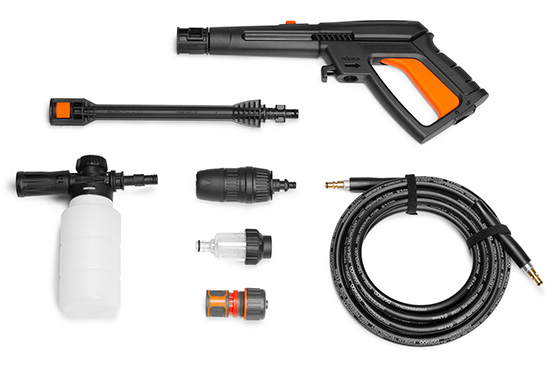 В комплекте идет: дополнительный пеногенератор на 0,6 литра. Насадка 4-в-1, для удаления всех видов загрязнений. Также в комплекте поставляется фильтр тонкой очистки и универсальный быстросъёмный коннектор с аквастопом.